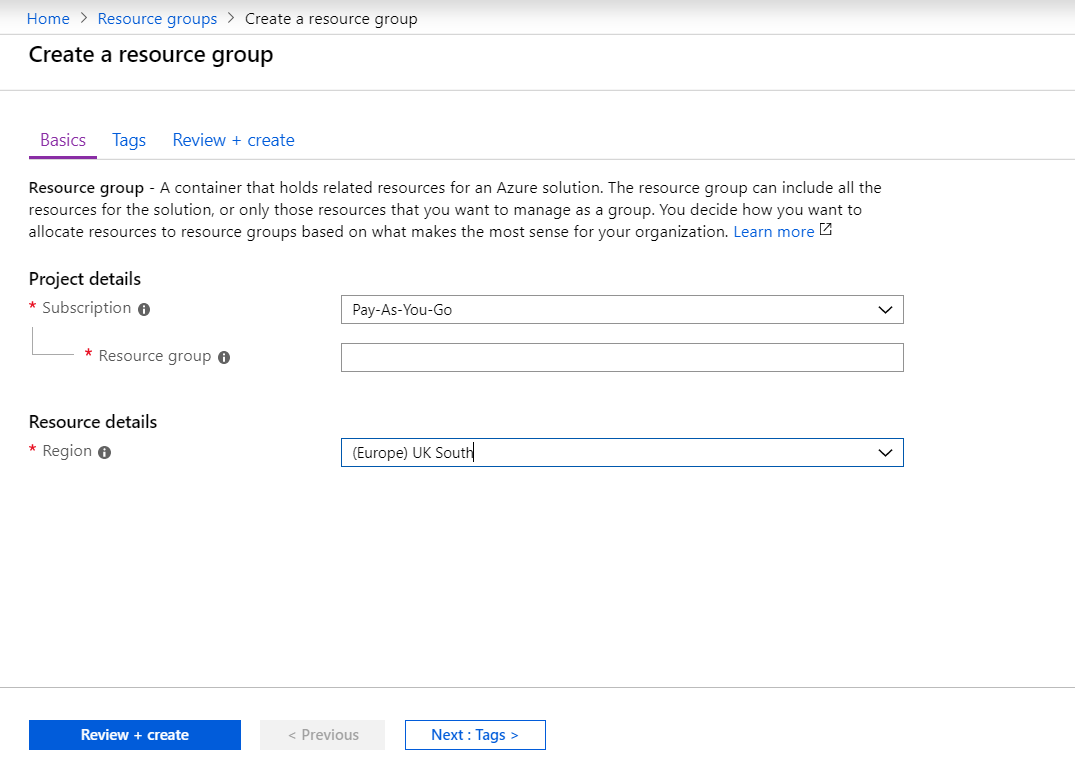 The important bit here though is the Region. Usually this is pretty simple, pick the one that geographically makes sense to your users as this will result in the lowest latency. However, some Azure products are not available in all Regions yet and this can’t be changed afterwards. If you’re thinking of using a resource that Azure have only just released, it probably wont be available in all Regions, so double check first whether this will cause you headaches later.