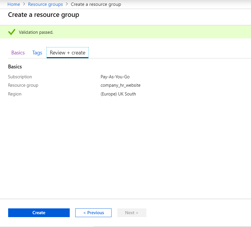Finally, assuming Azure passed the inputs and validated the details, click ‘Create’. This creates you an empty resource group that you can now associate your services with.