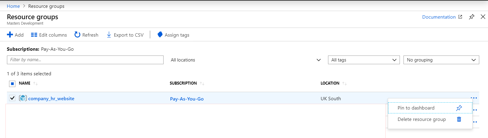 Going into the portal and selecting ‘Resource Groups’ from the left hand menu brings up the list view including the resource group we created earlier. Clicking name will take you to a list view of all the resources in that group, but what we want to do is click the three dots on the right hand side. This opens up a small menu with the option to ‘Delete Resource Group’. Click it.
