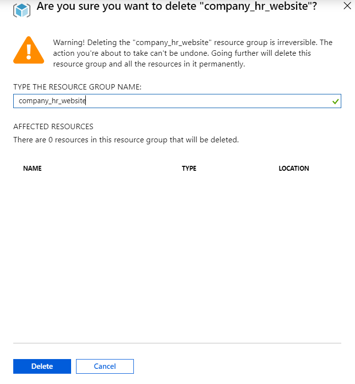 This options a blade that gives you a strict warning. Deleting a resource group deletes all resources it is associated with. This makes it a convenient tool to work on demos with. You can create a resource group, set up your products and then delete everything in one fell swoop.