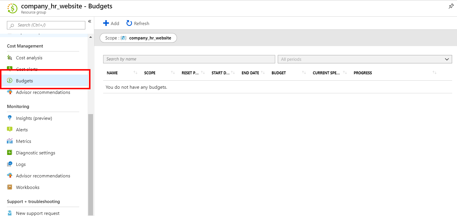 From the list of Resource Groups as shown above, click on the name to take you to the Resource Group details. From here, you can scroll to nearly the bottom of the blades left hand menu and select ‘Budgets’.
