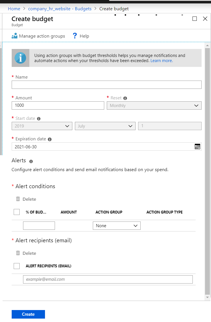 Budgets are a great and simple to use feature to allow you to set up an alert based on current expenditure of your account. It’s not predicative i.e.won’t alert if you’re expected to exceed a quota for the month, but it can be an easy way to be alerted if your resource eats through your monetary allowance quicker than expected.