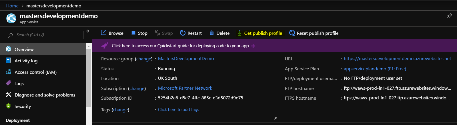 Once deployed, you can go to the resource to see that you have an app service, that has nothing in it. A quick note at this point, if you deployed an S1, even though you have nothing in here, it will be costing you. You have provisioned resource and even if you are not using it, Microsoft will charge you. From this screen the left hand menu contains an option for Scale Up, but this also lets you scale Down if you need to. It basically just means that you can change the tier after deployment if you need to.
