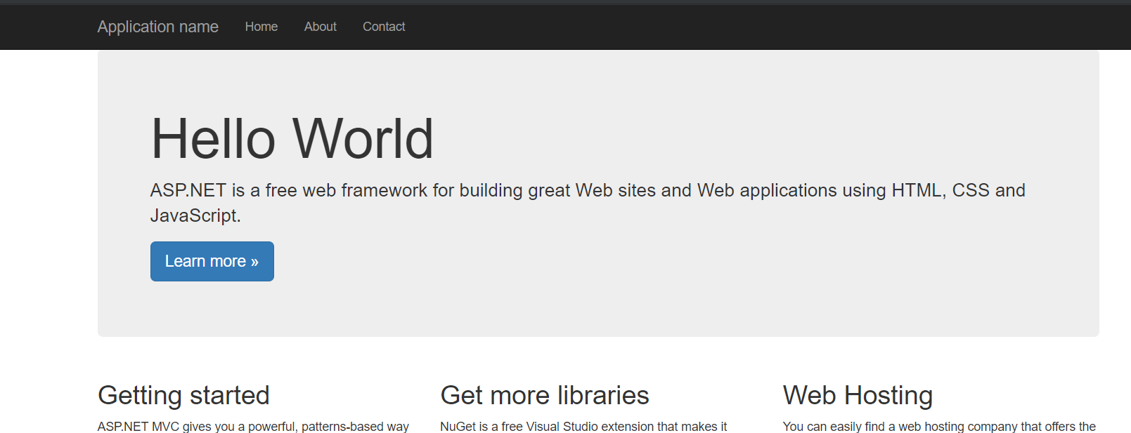 Create a simple .Net Framework application running MVC and tweak the View/Home/Index to identify that it is yours. I just altered the heading to ‘Hello World’.