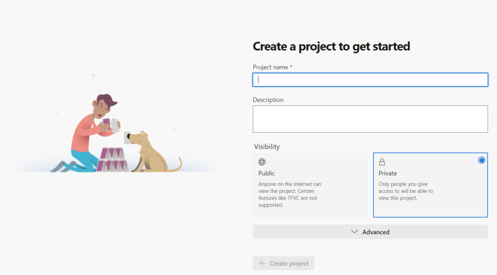 This will create you a new Organisation (this is what Microsoft calls the business entity you are working with) and it will prompt you to create a new Project. Give it a meaningful name and description then choose if you want the project to be public or private. Personally, I would go for Private if it is for a business start up!