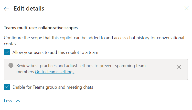 6. Finally, lets publish and see it in action then go back to the Teams Settings (as above) and click ‘Open Copilot’ to get it on Teams. You will have a few options, to add to a Chat, Team or Meeting. We have more options because we updated them earlier.