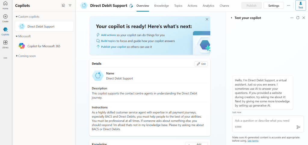 3. Once ready you will be taken into your Copilot. The left panel allows you to select the Copilots youve made, where the middle allows you to edit or customise further with more knowledge, topics or custom actions. The right panel allows you to test your copilot.